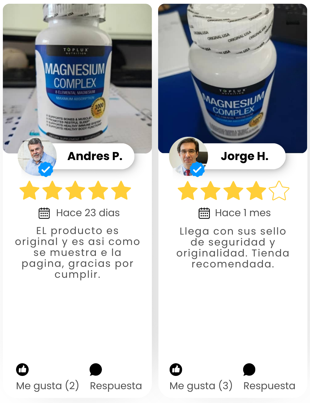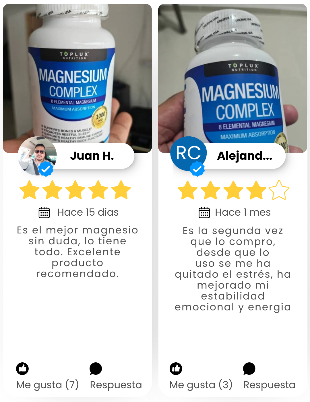 "Después de 2 semanas tomando Magnesium Complex Toplux, por primera vez en años dormí sin despertarme. ¡Increíble!"